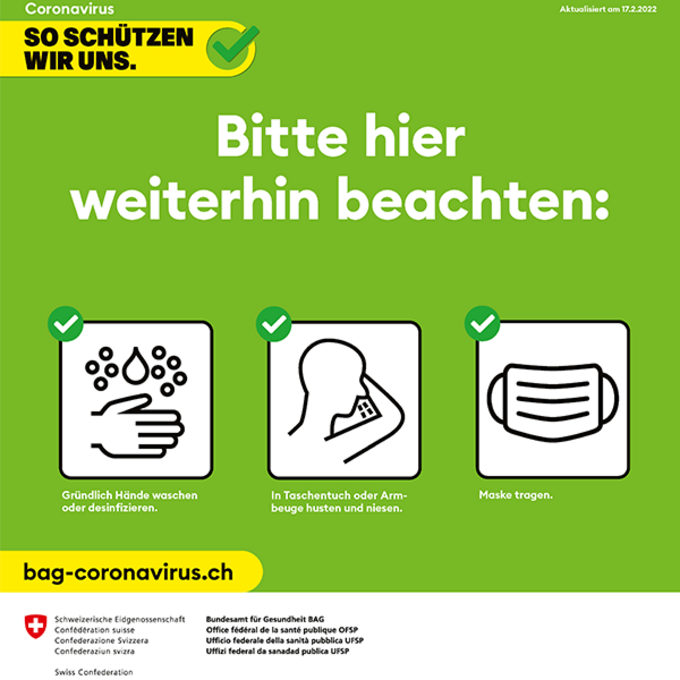 Wir danken Ihnen, dass Sie sich zum Schutz Ihrer Mitmenschen weiterhin generell umsichtig verhalten. Bitte beachten Sie, dass grössere Ausbrüche oder wesentliche Veränderungen der generellen Lage punktuell zu weiteren Veränderungen oder Einschränkungen führen können. In solchen Fällen reagieren wir kurzfristig und bitten Sie, Aushänge an unseren Haupteingängen sowie Meldungen auf unserer Internetseite zu beachten.